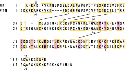 of human midkine (MK). Amino acids conserved with pleiotrophin (PTN) are boxed.