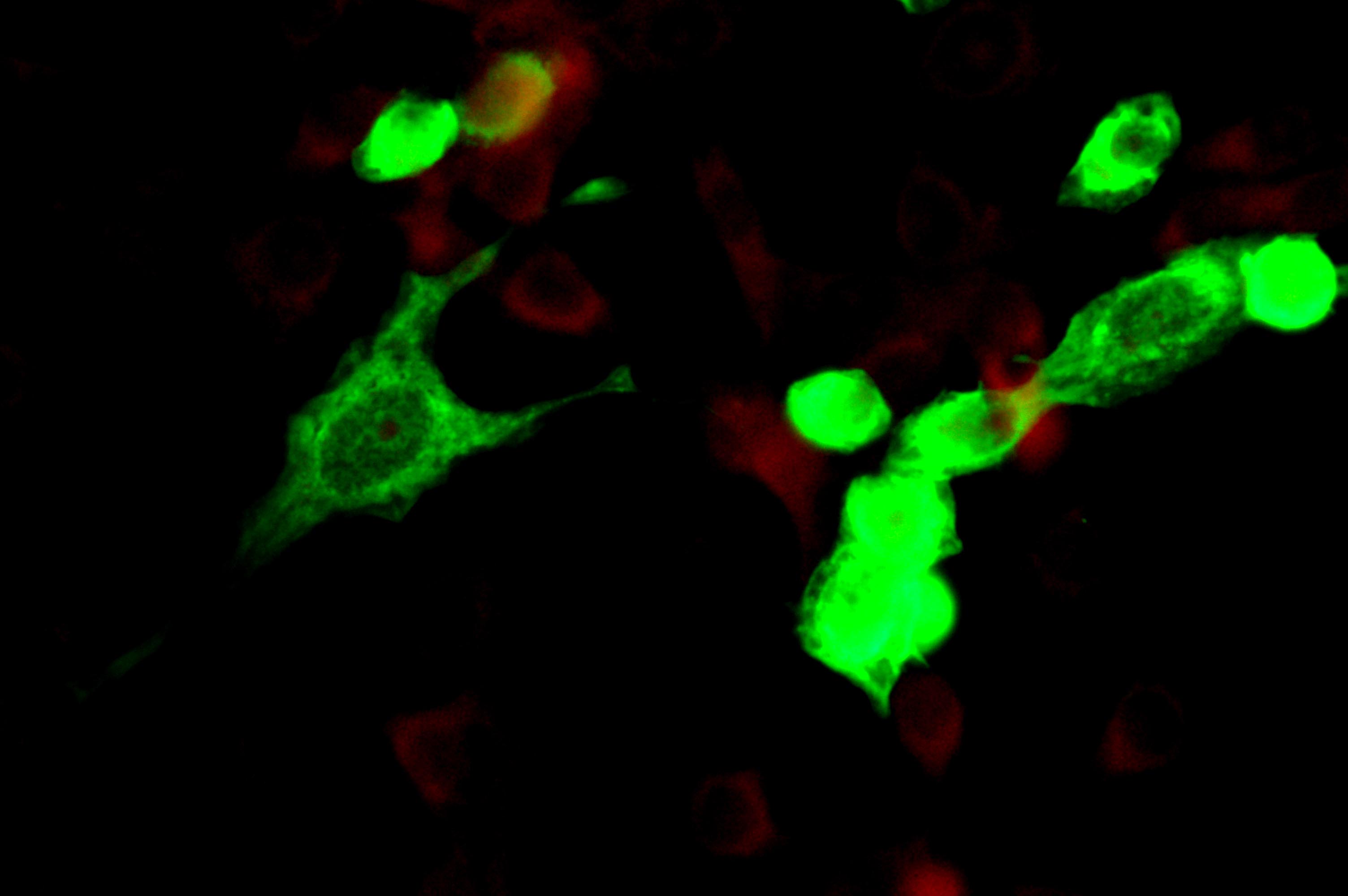 Substrate slides with each well containing containing infected and uninfected feline kidney (Crandall) cells, with infected cells demonstrating dense granular cytoplasmic and membrane fluorescence.